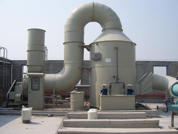 废气由风机引出后,首先进入酸雾废气净化塔。吸收塔中碱性洗涤液由循环泵抽至塔中经填料向下流动,酸雾废气逆流上升,在填料的湿润表面气液接触,发生一系列的物理化学反应,并由于浓度差而发生传质过程,从而完成了将气体的净化过程,净化后的废气脱水后经离心风机引出后达标排放。循环液定期排放至污水处理站。